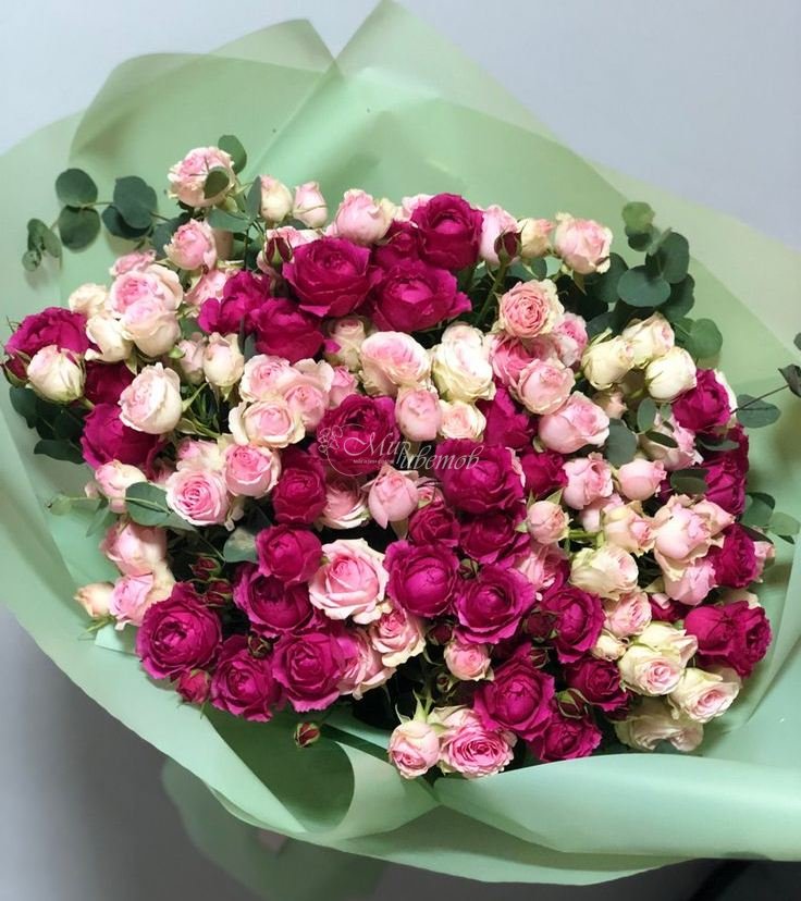 Розы Кустовые розы Герберы Альстромерии Гвоздики Зелень Пленка матовая Лента атлас