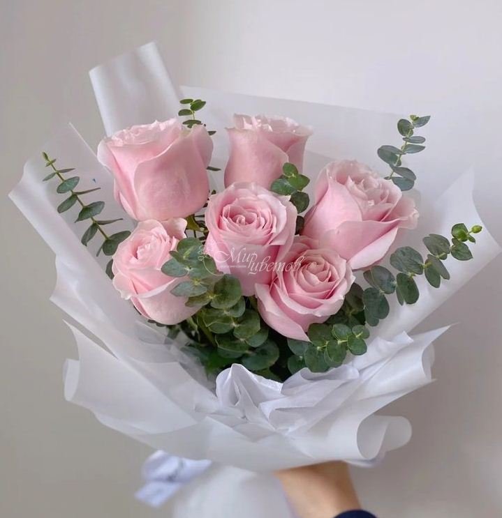 Роза розовая Эвкалипт Пленка матовая Бумага тишью Лента атлас