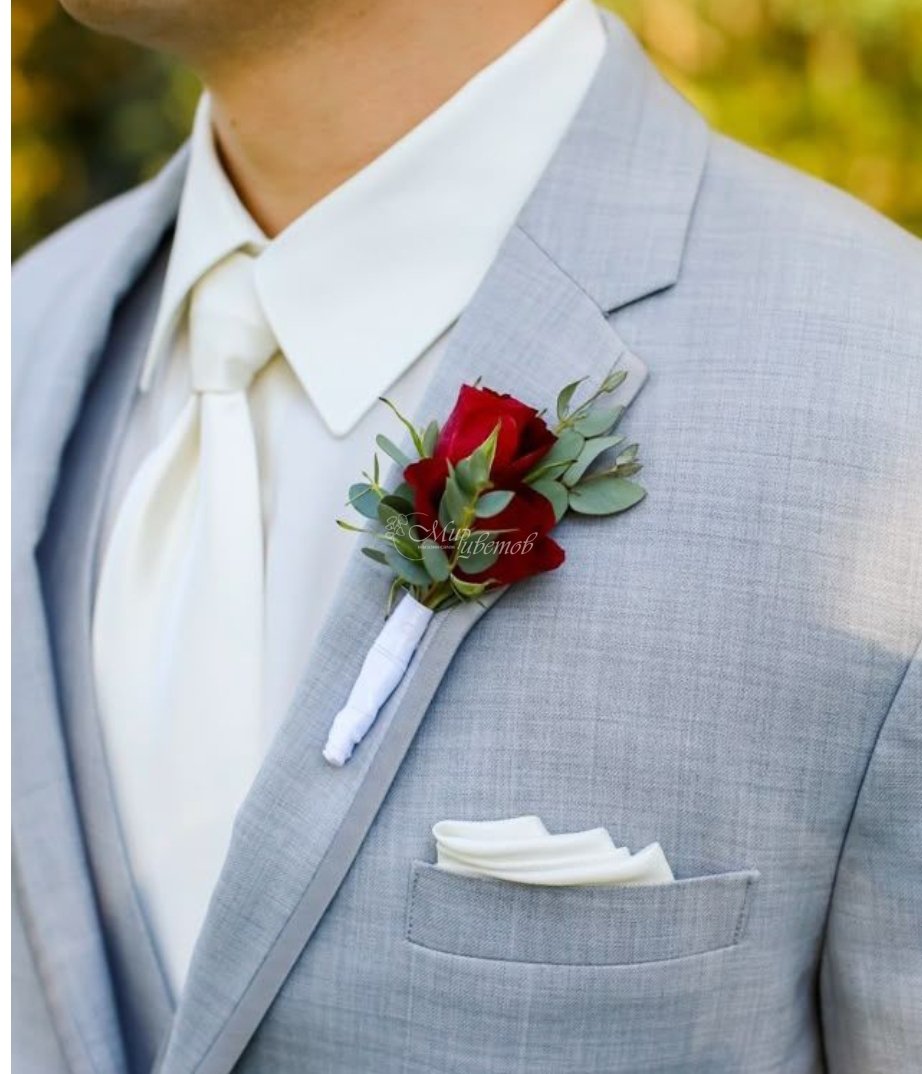Бутоньерка жениха подбирается из стиля фасона и тематики свадебного букета невесты