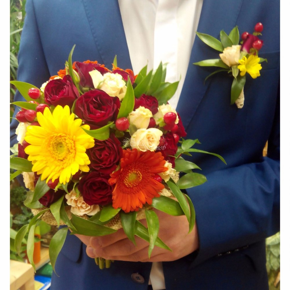 Гербера Роза кустовая Гиперикум Хризантема кустовая Рускус Лента атлас Бутоньерка